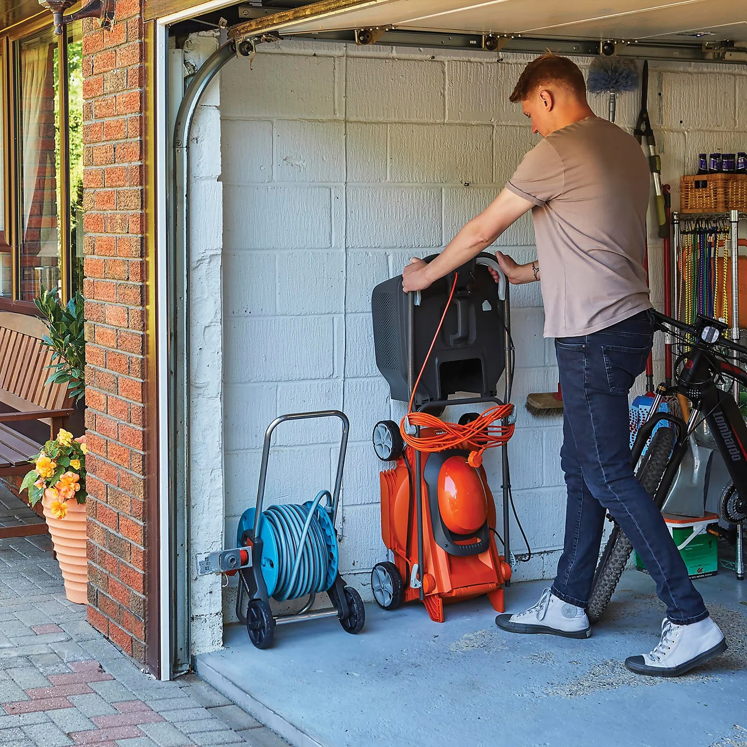 • The clever vertical storage position means it takes up less floor space keeping your shed neat and tidy, or you can simply fold the handles down flat to store away neatly